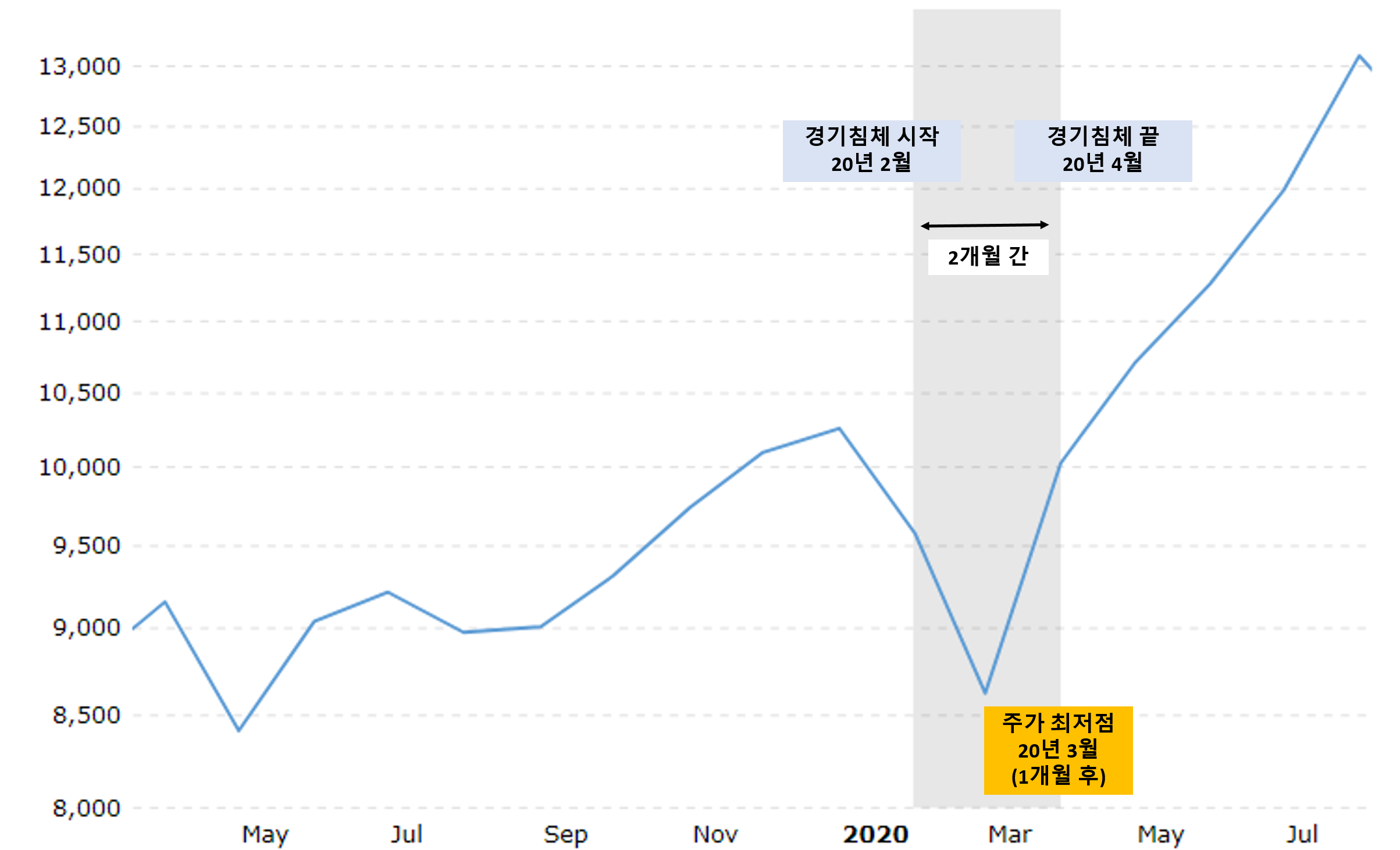 주가 최저점은 경기침체기가 끝난 후에 나타난다. 경기침체 중간에 주가가 최저점을 지나고 상승하기 시작하는 것과 대비된다.