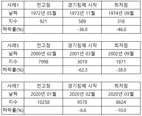 그래서, 위 7가지 사례 중에서 '경기침체 전부터 주가가 많이 떨어진 사례'를 찾아볼 필요가 있다.