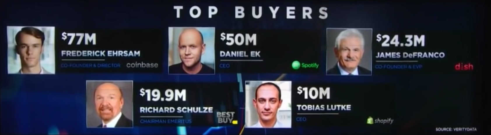 2등은 스포티파이의 CEO로, 5,000만 달러의 주식을 매수했다.