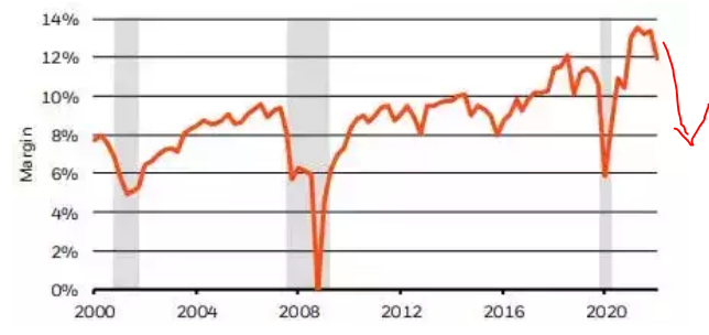 유가 등 에너지 가격이 계속 올라라고 임금이 계속해서 상승하기 때문에 기업의 이익이 타격을 입을 것인데 아직 어닝 컨센서스에 이것들이 반영되어 있지 않다. 월가의 S&P500 기업들의 어닝 예상치가 10% 정도인데 이는 너무 낙관적이라는 말이다.
