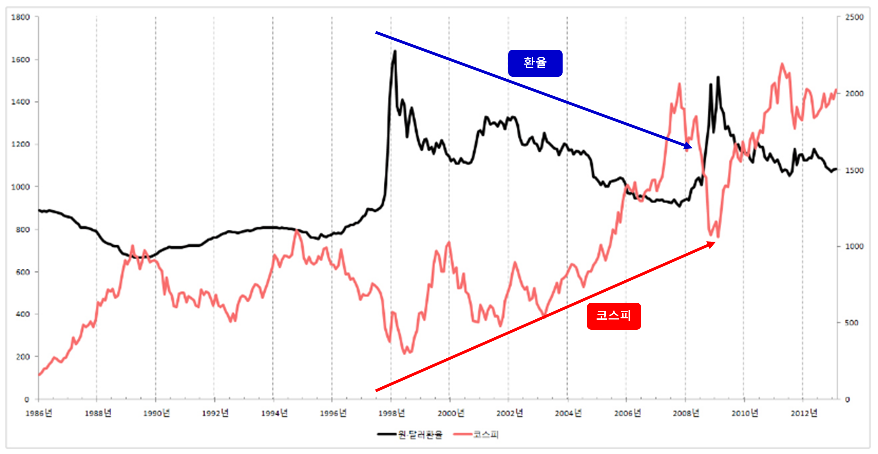 몸소 느끼는 것처럼 환율과 주가, 특히 코스피는 기본적으로 반비례한다.