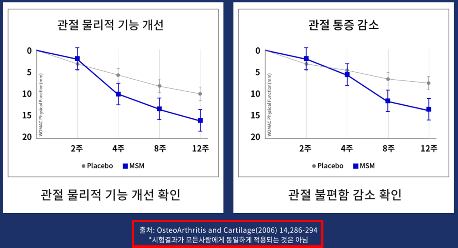MSM을 섭취한 그룹과 섭취하지 않은 그룹으로 나눠 통증지수를 비교해보니 MSM 섭취군의 통증이 감소했다고 한다.