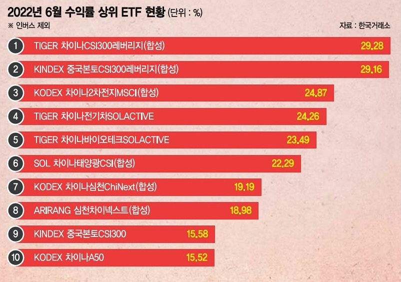 전 세계 증시가 하락하는 와중에 중국 홀로 수익률이 좋다. 6월 한 달 기준 국내 상장 ETF에서 인버스 상품을 제외하면 1위~17위 모두 중국 관련 ETF가 차지했다.