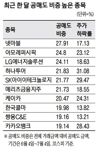 참고로 공매도 비중이 높았던 종목은 넷마블, 아모레퍼시픽, LG에너지솔루션, 하나투어, SK아이이테크놀로지 순서였다.