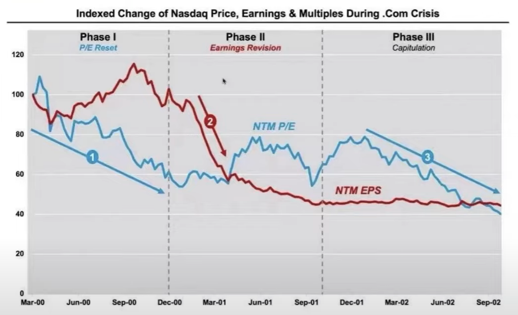 1단계는 PER를 재평가 하는 시기. 즉, 빅테크 기업에 PER를 100이상 주면서 '돈 못벌어도 괜찮아. 미래에는 잘 벌겠지...'하던 심리가 위축되어 PER를 많이 쳐주지 않는 상황을 1단계라고 한다.
