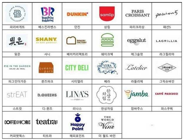파리바게트, 배스킨라빈스, 던킨도너츠, 삼립, 파리크라상, 패션5, 빚은, 샤니, 베이커리팩토리, 쉐이크쉑, ㅇ그슬럿, 라그릴리아, 피그인더가든, 퀸즈파크, 시티델리, 베라, 라뜰리에, 그릭슈바인, 스트릿, 디-퀸즈, 리나스, 한상차림, 잠바주스, 파스쿠찌, 커페앳웍스, 티트라, 해피포인트, 더 월드 바인