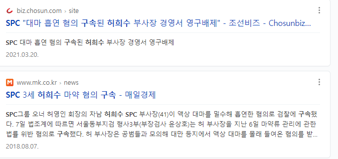 SPC그룹의 전 부사장 허희수는 불법약물을 흡입해 검찰에 구속된 적이 있다. 그는 SPC회장의 차남으로, 국내에 쉐이크쉑을 들여온 것으로 유명하다. 하지만 2018년, 그가 해외에서 액상대마를 반입해 이를 흡입한 사실이 발각되며 징역3년에 집행유예 4년을 선고받는다. 당시 SPC측에서는 그를 경영에서 영구히 배제하겠다고 했으나, 불과 3개월 만에 그가 다시 경영에 복귀했다는 사실이 알려져 많은 비판을 받았다.