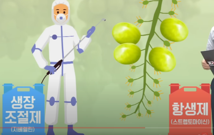 샤인머스캣에는 씨가 없다. 씨없는 샤인머스캣을 만들기 위해서 먼저 단백질 합성을 막는 항생제(스트렙토마이신)를 뿌리고, 그 다음 씨가 없어도 계속 클 수 있도록 생장조절제인 지베렐린을 뿌린다. 여기서 생장조절제인 지베렐린이 성조숙증을 유발한다고 의심이되는 물질이다.