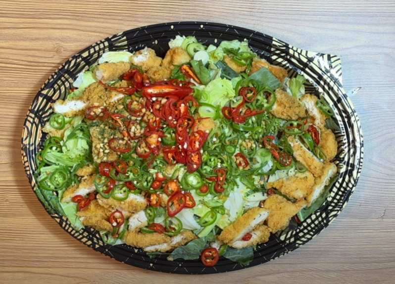 양상추, 고추, 양파 등의 야채와 닭다리 살의 조합으로, 닭이 들어간 샐러드의 느낌도 납니다.