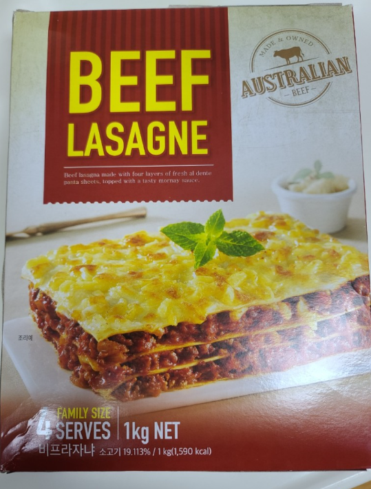 전자레인지 18분, 오븐에서 40~45분간 조리해야 하는 제품으로 시간이 다소 많이 소요됩니다. 1kg짜리 큰 덩어리 하나로 되어 있습니다. 느끼한 것 잘 먹는 성인남자 2인분의 양입니다. 라자냐 면이 겹겹이 쌓여있고 면과 면 사이에는 미트소스와 치즈가 있습니다.