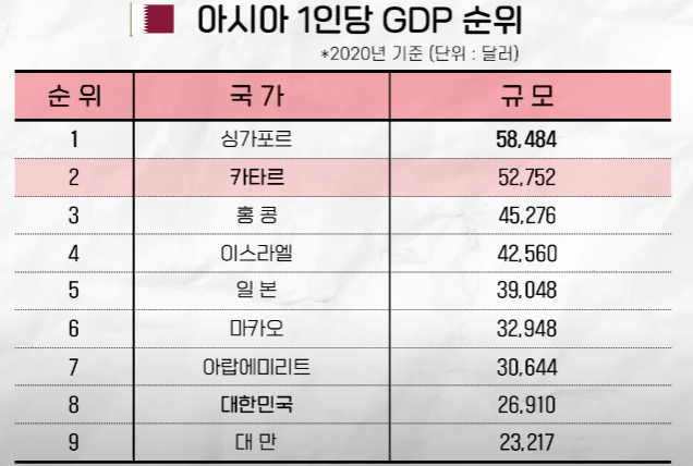 카타르의 1인당 GDP 순위는 아시아에서 2위다. (인구가 적어 전체 GDP는 50위권이다.)