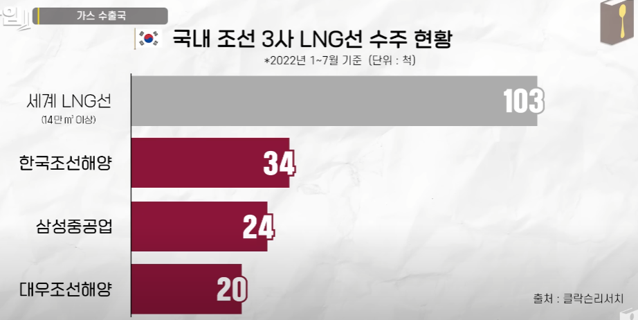 카타르가 가스 수출국이라는 것에서 우리나라와의 접점도 있다. 러시아-우크라이나 전쟁을 계기로 카타르는 유럽이라는 새로운 가스 시장을 확보한다. 카타르에서 유럽으로 이어진 가스관이 없기에 천연가스를 액화한 LNG를 선박으로 운반하는데 이 선박이 더 많이 필요하게 되었고, 이를 우리나라에서 주로 수주하고 있다.