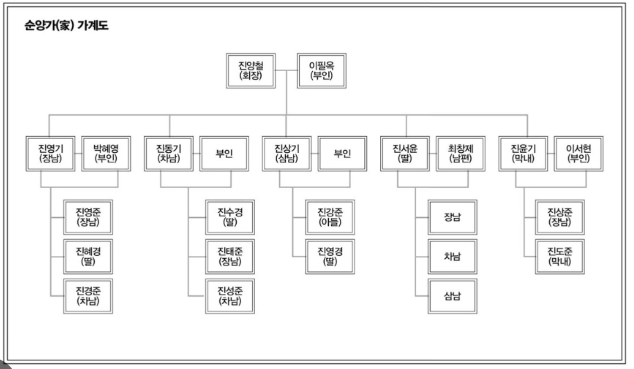 참고로 순양그룹의 창업주는 진양철 회장이고, 슬하에는 아들 넷과 딸 하나가 있다. 첫째 아들 진영기는 부회장으로 '순양그룹'의 주력인 전자와 물산을 담당하고 있다. 그는 진양철 회장 사후에 자신이 순양그룹을 물려받을 것으로 생각하고 있다. 둘째 진동기는 건설 분야를 담당하고 있으며 형보다 똑똑한 인물이다. 형이 가진 것을 빼앗고 자신이 회장이 될 기회를 노리고 있다. 막내 아들 진윤기는 가장 똑똑했으나 기업을 물려받기를 포기하고 영화감독이 되기를 희망했다가 영화배우 이해인과 결혼한 후 집안으로부터 버림받았다. 윤현우는 이 진윤기의 둘째 아들 진도준으로 다시 태어났다.