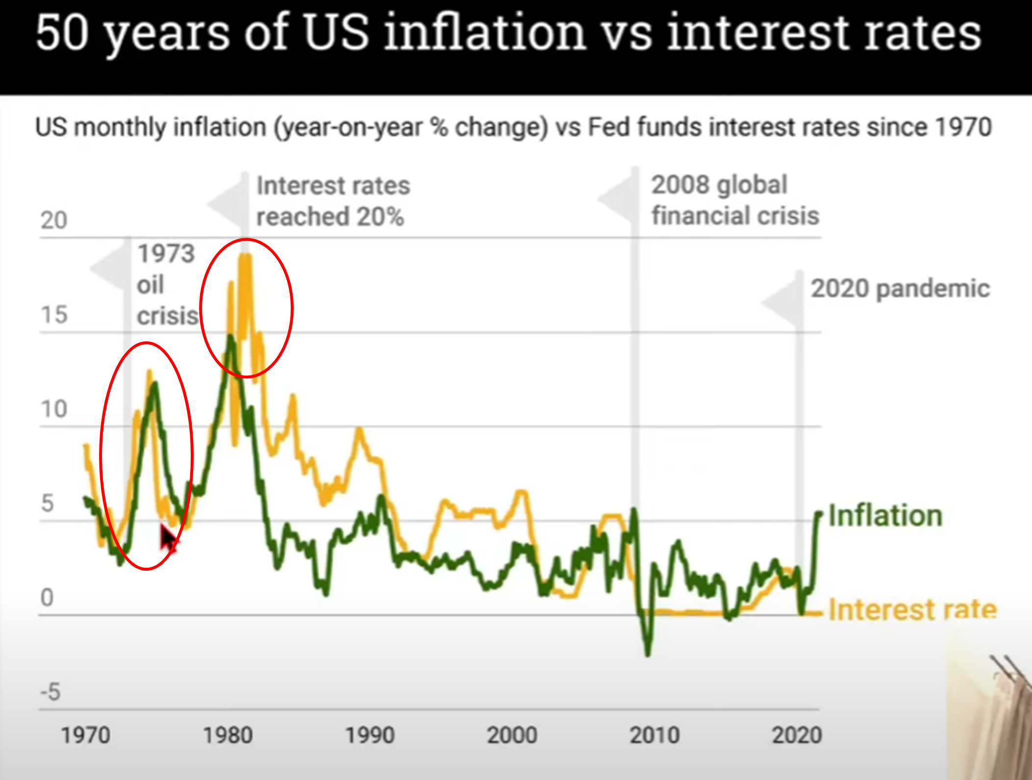 너무 이른 완화정책이 위험하다는 말을, 과거 데이터를 보면서 이해해보자. 아래 그림에서 초록색은 인플레이션, 노란색은 금리를 나타낸다. 먼저 70년대 중부반을 보면 물가가 조금 내려가는 듯해보이니 금리를 그것보다 더 빨리 내린 사례가 있다. 그러자 70년대 말 물가가 다시 올라가는 부작용이 나타났다. 그러자 80년대초반은 물가가 내려가도 한동안 높은 금리를 유지하는 식으로 정책을 바꾸었고, 물가를 잡는 데 성공한다. 70년대 중부반처럼 물가가 떨어진다고 바로 금리를 내리는 과오를 다시 범하지 않겠다는 뜻으로 풀이된다.