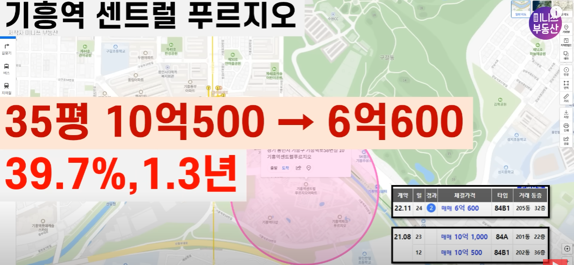 6위는 용인시 기흥구 구갈동에 위치한 '기흥역 센트럴 푸르지오'로, 하락률 39.7%를 기록했다. 35평형이 1.3년만에 10억 500만원에서 6억600만원으로 떨어졌다.