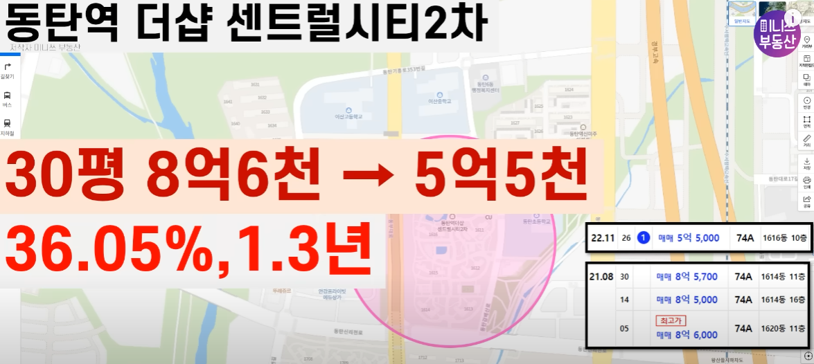 8위는 화성시 오산동에 위치한 '동탄역 더샵 센트럴시티 2차'로, 하락률 36.05%를 기록했다. 30평이 1.3년만에 8억 6천에서 5억 5천으로 떨어졌다.