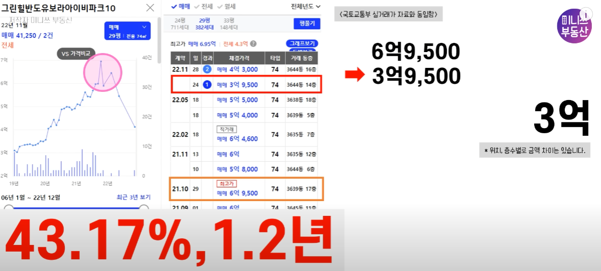 1위는 화성시 산척동에 위치한 '반도유보라 아이비파크 10차 그린힐'로, 하락률 43.17%를 기록했다. 최고가 6.95억에서 1.2년만에 3.95억으로 3억 떨어졌다.