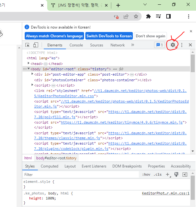 F12키를 누르면 화면의 오른쪽에 코드를 입력하는 창이 뜬다. 거기에서 다시 오른쪽 위를 보면 톱니바퀴 모양이 있을 것이다.