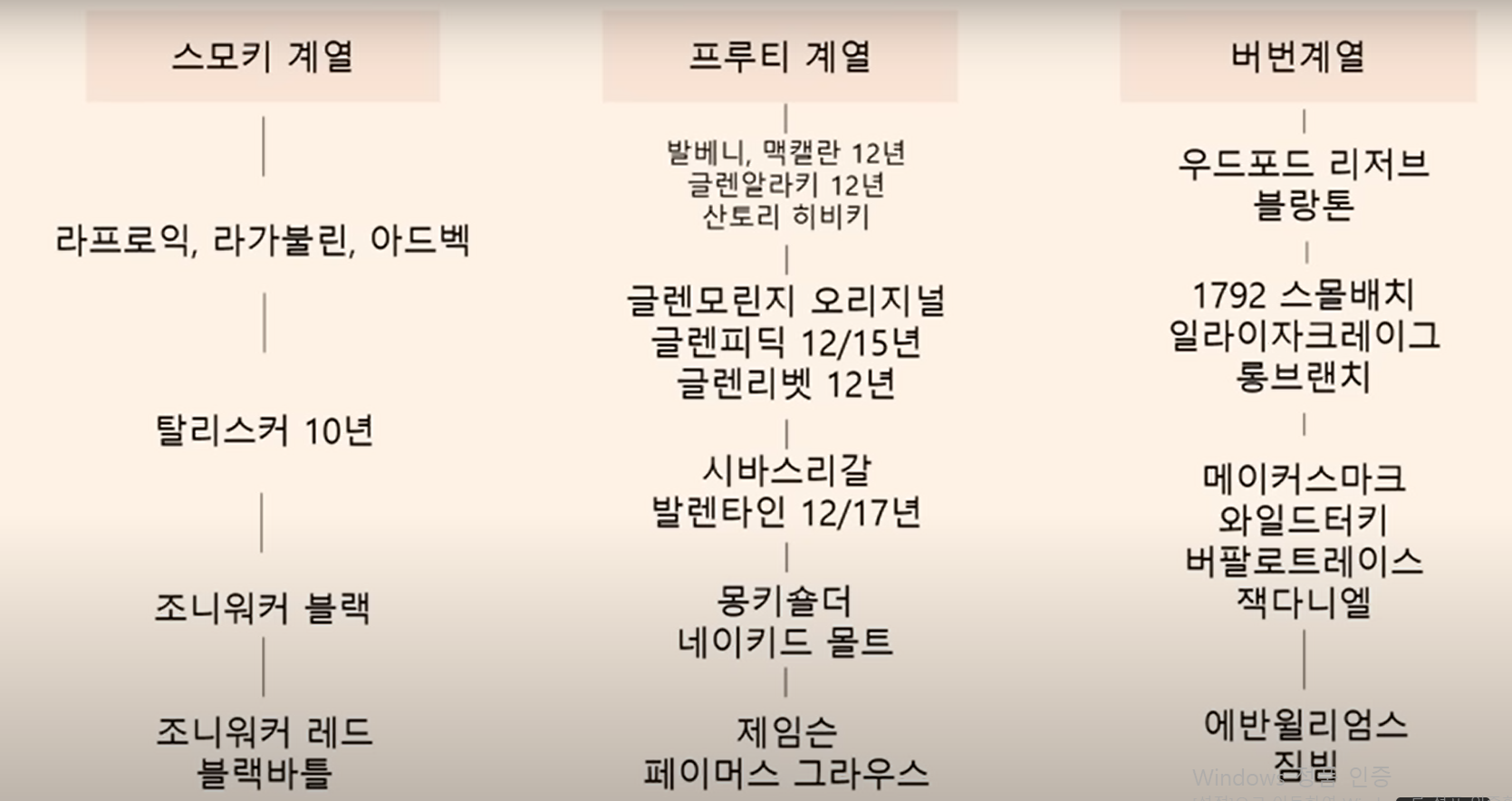 스모키한 계열, 과일향이 나면서 부드러운 프루티 계열, 바닐라, 초콜릿 향이 나는 버번 계열로 나누어 살펴볼 예정이다.