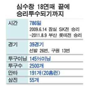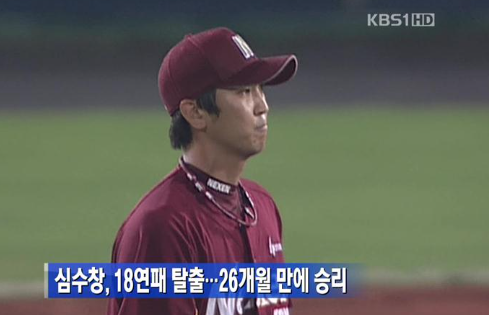 심수창은 2009년 6월 26일 LG 소속으로 SK 전에서 패전 투수가 된 이후, 롯데를 거쳐 넥센으로 이적했으며, 2011년 8월 3일 삼성전 패배까지 18연패를 당했다. 그리고 2011년 8월 9일 넥센 선발투수로 나와 롯데를 상대로 퀄리티 스타트를 기록하면서 18연패 기록을 깨게 된다. 18연패 전 승리 이후 786일, 39경기, 145이닝 만의 승리를 맛 본 것이다.