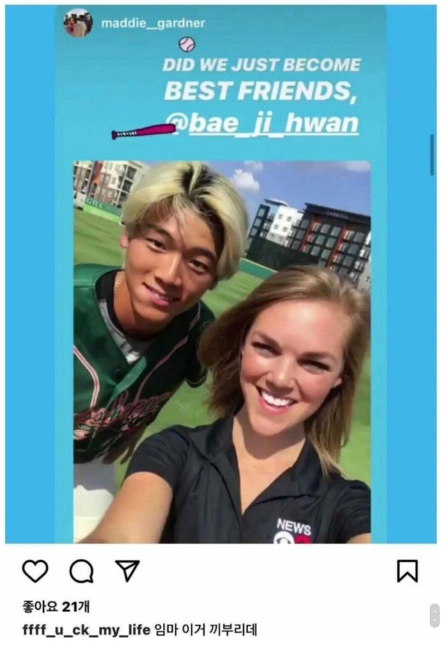 이 외에도 한 미국인 여성 리포터와 촬영한 셀카를 올리고는 '이거 끼부리데'라는 여성 혐오성 발언을 하기도 했다.