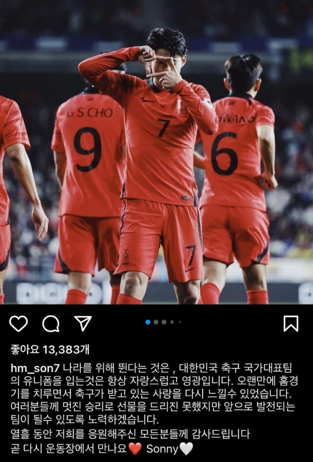 그렇게 어느정도 진정되던 와중에 손흥민이 국가대표 소감과 국민에 대한 감사의 글을 올리는데, 이 글의 내용에 김민재를 까는 듯한 내용이 담긴다. '나라를 위해 뛴다는 것은, 대한민국 축구 국가대표팀의 유니폼을 입는 것은 항상 자랑스럽고 영광입니다'