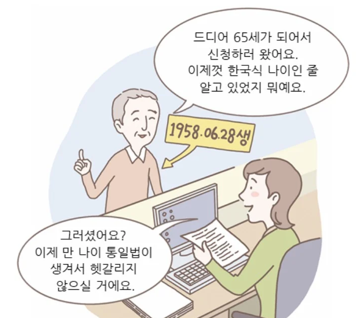 기초연금 수령 연령이 만65세다. 그래서 글을 쓴 날짜 2023년 6월 15일을 기준으로, 1958년 6월 28일생 할아버지께서는 생일이 지났으므로 '2023-1958=65세'가 되어 기초연금을 신청할 수 있게 된다. 국민연금 수령 개시 연령 역시 만 나이로 규정되어 있다. 이번 만나이 법이 시행되면서 국민연금 수령 개시가 늦어진다는 주장이 있는데 이는 사실이 아니다.