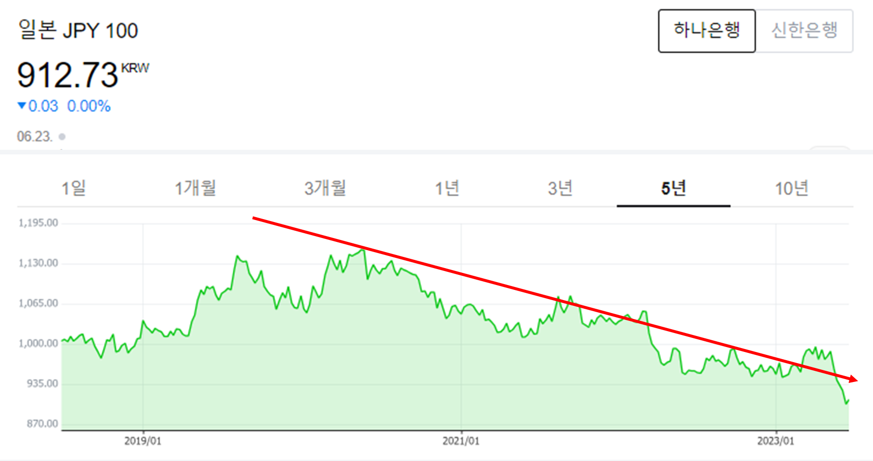 23년 6월 23일 기준으로 원엔환율이 912원 정도 된다. 원엔환율은 100엔에 대한 우리 원화의 가치를 나타낸다. 엔의 가치가 오르면 100엔을 교환하는 데 우리원화가 많이 필요할 것이다. 반대로 지금은 엔의 가치가 떨어지고 있어 100엔을 교환하는 데 우리 원화가 이전보다 적게 필요한 것이다. 즉, 원엔환율을 볼때는 가치와 환율이 같은 방향이다. 엔저가 되면(=엔화가 약세면) 환율도 떨어지고, 엔고가 되면(=엔화가 강세면) 환율도 올라간다는 말이다.