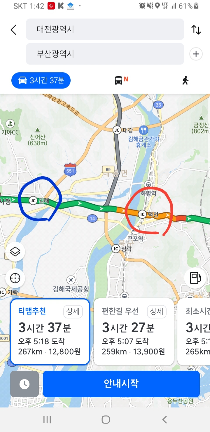 대전에서 부산으로 고속도로를 타고 간다고 예를 들어보자. 티맵에서 대전->부산 경로를 검색해보면 대전IC를 통해 경부고속도로로 진입을 하게 된다. 이후 비룡JC, 김천JC, 김해JC 등을 거쳐서 덕천IC에서 고속도로를 빠져나가는 경로를 확인할 수 있다.