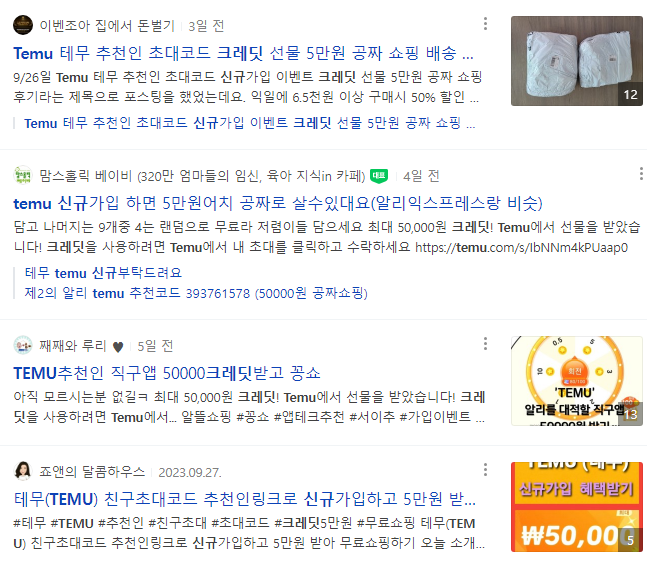 이와는 반대로 크레딧 교환 이벤트는 비추천한다. 이미 TEMU(테무)에 가입한 사람이 친구 초대를 하면 최대 5만원의 크레딧을 받아 현금처럼 쓸 수 있다. 온라인 상에서는 이미 가입한 사람들이 '5만원 공짜'라는 자극적인 문구로 사람들을 TEMU(테무)에 가입하도록 하고, 자신의 코드를 쓰도록 유인하고 있다. 이러한 수법은 다단계와 마찬가지로 내가 돈을 벌려면 다른 사람들을 끌어들여야 하는 구조다. 짧은 이벤트 유효기간 동안 대략 10여 명의 추천을 받지 못하면 나는 5만원의 혜택을 받을 수 없다. 괜히 사람들 끌어들이지 않도록 하자.