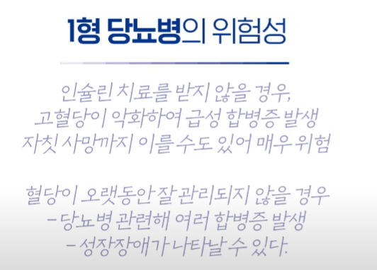또한 혈당이 오랫동안 잘 관리되지 않을 경우, 여러가지 당뇨병의 합병증이 발생할 수 있습니다. 성장기의 소아 청소년이 혈당조절이 불량하면 성장장애도 겪을 수 있어 적절한 혈당관리는 꼭 필요합니다.