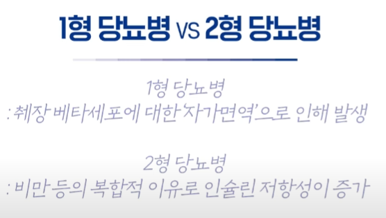 1형 당뇨병은 췌장 베타세포에 대한 자가면역으로 인해 발생합니다. 그에 반해 2형 당뇨병은 비만을 포함한 여러 복합적인 이유로 인슐린 저항성이 증가하여 생기는 당뇨병입니다.