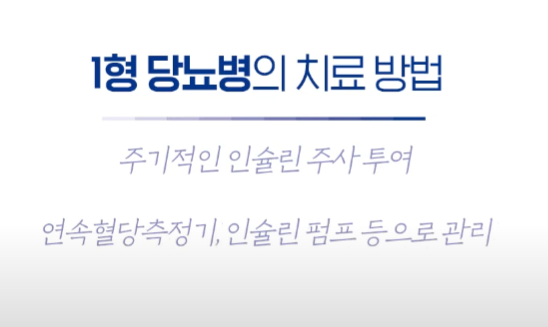 1형 당뇨병은 신체에 인슐린 분비를 담당하는 췌장의 베타세포 소실로 인슐린 분비가 되지 않아 생기기 때문에, 주사로 인슐린을 투여하는 것이 최선의 치료법입니다. 아직 당뇨병을 완치하는 방법은 없지만 연속혈당 측정기, 인슐린 펌프와 같은 기기들이 당뇨병을 효과적으로 관리하는 데 도움을 주고 있습니다.