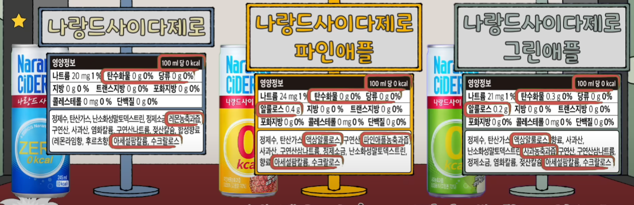 우선 가장 많이 볼 수 있는 것은 합성감미료입니다. 합성감미료가 가격은 싸고 당도는 높기 때문입니다.