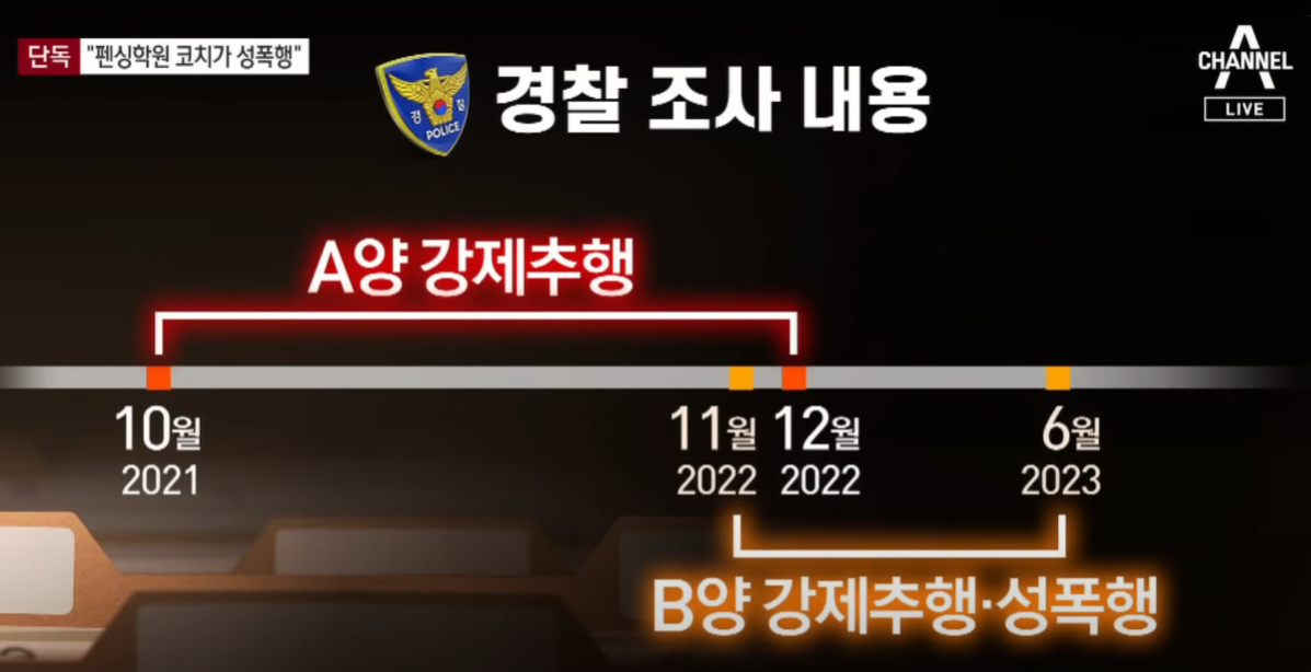 경찰 조사 내용에는 코치가 개인 지도를 핑계로 A양을 자신의 집으로 불러 1년 넘게 강제추행한 혐의가 담겼습니다. 또한 중학생인 B양은 약 7개월동안 성폭행 당한 것으로 알려졌습니다.