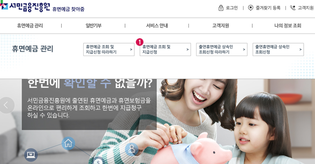 휴면예금이 있는지 조회해보고 신청을 할 수 있는 가장 간단한 사이트는 '서민금융진흥원'입니다. 해당 사이트에 접속한 후 상단 메뉴의 '휴면예금 관리' -> '휴면예금 조회 및 지급신청'을 클릭하시면 됩니다.
