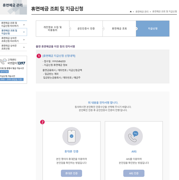 휴면예금 지급신청 내역을 확인하는 창이 뜨며, 신청 내용에 동의한다면 휴대폰 인증 또는 ARS 전화를 통해 전자서명을 진행합니다.