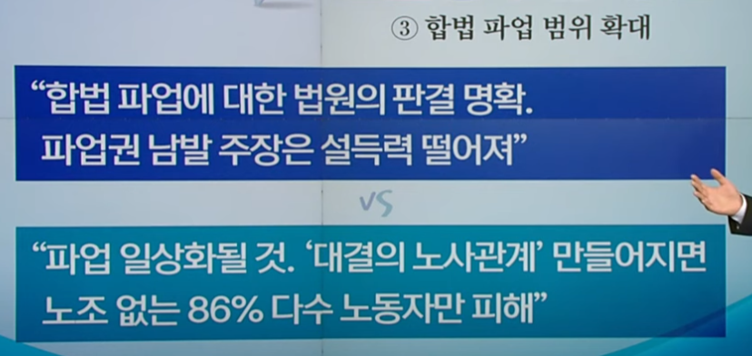 반대 의견 : 파업이 일상화될 것이며, 이러면 소비자와 노조 없는 86%의 노동자가 오히려 피해를 본다.