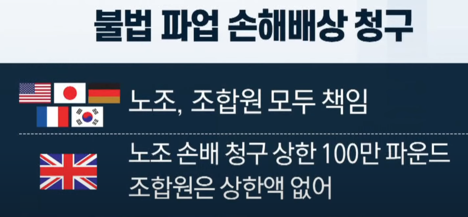 현재 불법파업에 대한 손해배상을 막는 나라는 없습니다. 다만, 영국은 노조원의 수에 따라 손해배상액의 청구액에 상한선을 두고 있습니다. 이 상한액은 100만 파운드, 우리나라 돈으로 16억원 정도입니다. 이 노란봉투법이 전세계 전례가 없는 법임에는 분명해보입니다.