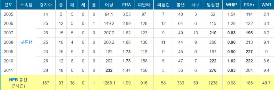 참고로, 다르빗슈 유도 일본프로리그에서 7시즌을 뛰고 MLB에 진출했었습니다. 그는 통산 167경기에 출장해 93승 38패 1268.1이닝을 투구했습니다. 삼진은 1238개, WHIP는 0.98, 평균자책점은 1.99를 기록했습니다.