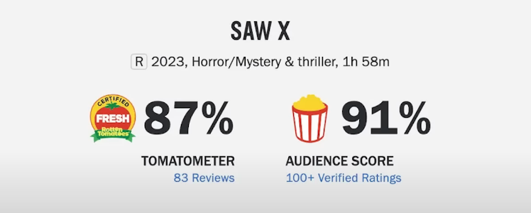쏘우X는 12월 13일 국내에서 개봉합니다. 이미 해외에서는 개봉을 했는데요, 쏘우X는 쏘우 시리즈 사상 최초로 로튼 토마토 신선도 87%로 프레시 마크를 획득한 작품입니다. 로튼 토마토 팝콘 지수 역시 91%로 시리즈 역대 최고 점수를 받았습니다. 북미 박스오피스 1위 등 전세계 47개국 박스오피스 1위에 오른 작품이니만큼, 우리나라에서도 흥행을 할 수 있을지 기대가 됩니다.