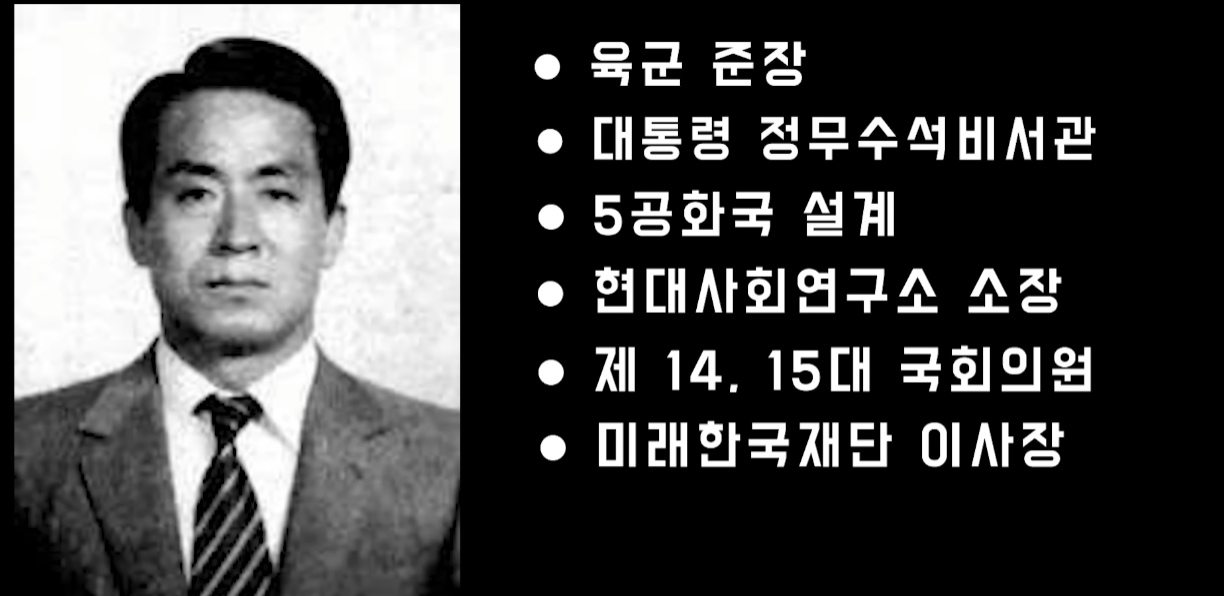 전두환이 보안사령관으로 있던 시절, 그의 비서실장으로 지내며 군사반란을 설계한 전두환의 최측근입니다. 육군 준장으로 진급함과 동시에 예편한 후, 1980년 대통령 보좌관으로 청와대에 입성합니다. 연좌제 폐지, 학생두발 자율화, 야간통행 금지령 폐지 등을 기획하며 공화국을 주도적으로 설계하는 등 명실상부한 정권의 2인자 역할을 합니다.