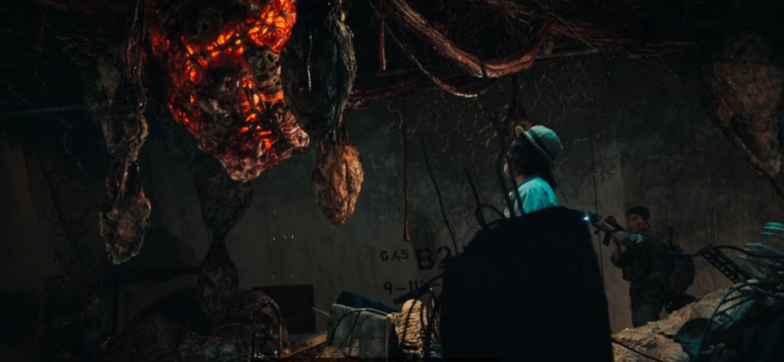 한편, 김중사가 부하를 찾으러 들어간 곳에는 엄청나게 커다란 괴물이 하나 있습니다. 임박사는 그 괴물을 흐뭇하다는 듯 바라봅니다. 김중사의 부하는 이곳에서 사람을 한명(자영) 발견하는데, 그녀는 군복 입은 사람을 봤다며 위치를 알려준다고 말합니다. 하지만 그녀를 따라가니 용석이 갇혀 있습니다.