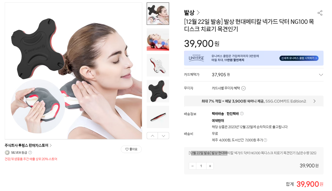 위에서 백지영씨가 쓰고 있으며 강력 추천하는 그 목견인기는 <넥가드 닥터 NG100>이라는 제품입니다. 아래 링크를 통해 제품 구매페이지로 넘어갈 수 있는데요, 12월 3일 기준으로 남은 수량이 300여개 정도라고 되어 있네요. 또한 구매 폭주로 인해서 12월 22일에 발송이 시작된다고 하니 참고하시기 바랍니다.
