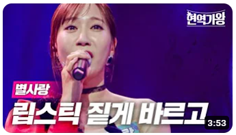 10위는 별사랑의 '립스틱 짙게 바르고', 조회수는 7.4만입니다. 노래와 한몸이 되어 눈물을 글썽이며 몰입한 감정표현이 압권인 무대입니다. 25점을 기록했습니다.