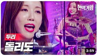 3위는 두리의 '돌리도' 로, 조회수는 17만입니다. 신들린듯한 드럼 퍼포먼스가 인상적이었습니다. 목소리도 시원시원하니 듣기만 해도 스트레스가 풀렸던 무대입니다. 21점을 기록했습니다.