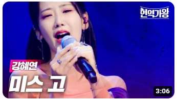 8위 애교폭발 강혜연의 '미스고', 조회수는 8.9만입니다. 본인에게 잘 어울리는 세미트롯이 아니라 아무나 쉽게 부를 수 없는 정통 트롯을 선곡했는데요. 이건 그만큼 강혜연의 자신감을 증명해주는 것이라 생각합니다. 24점을 기록했습니다.
