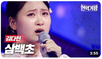 1위는 현역가왕 최연소 참가자 김다현이 부른 '삼백초'입니다. 해당 영상은 현재 조회수 63만을 기록 중입니다. 음정, 감정호소력이 최고인 무대입니다. 최연소 참가자이지만 우승후보임에 명백해보입니다. 26점을 기록했습니다.