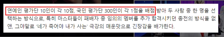 첫째, 보통의 데스매치 무대는 마스터들의 평가로만 이루어졌습니다. 그런데 이번 현역가왕의 데스매치는 국민평가단의 평가가 반영됩니다. 좀 더 자세히 들여다보면, 연예인 평가단 10인이 각 10점으로 총 100점, 국민평가단 300인이 각 1점으로 총 300점입니다. 본선 1차전 무대부터 연예인 평가단보다는 대중들의 평가에 무게를 두겠다는 의지가 보이는 부분입니다.