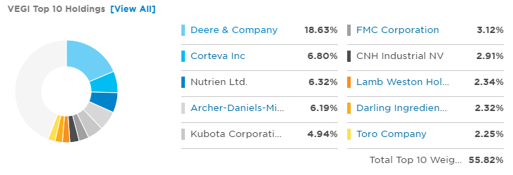 이름은 VEGI(iShares MSCI Global Agriculture Producers ETF). 농업관련 기업들을 모두 모아둔 ETF다.